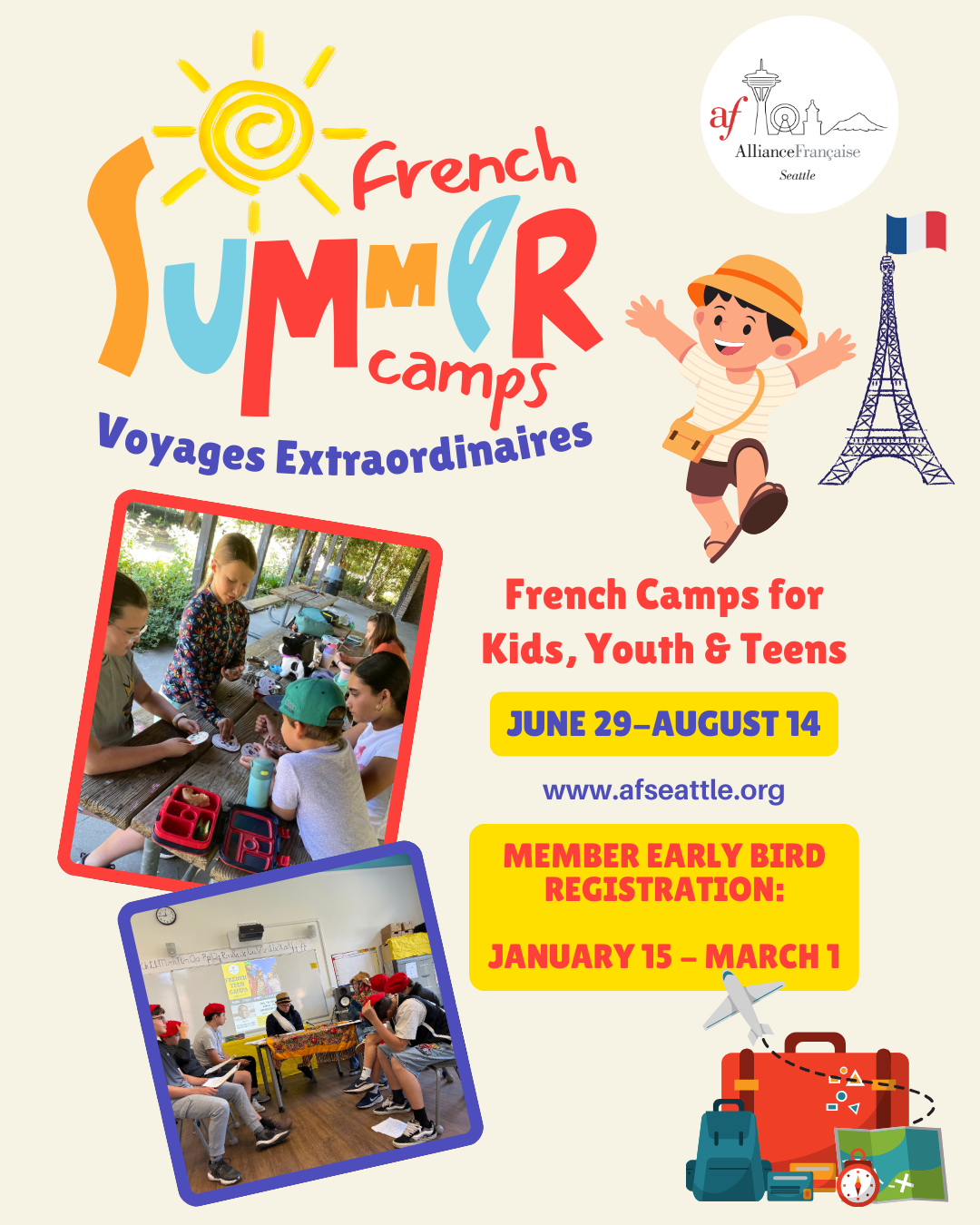 L’Alliance Française de Seattle recherche des animateurs francophones pour ses camps d’été en français destinés aux enfants de 6 à 12 ans. Les camps mettent l’accent sur l’immersion linguistique à travers jeux, créativité et vie de groupe.