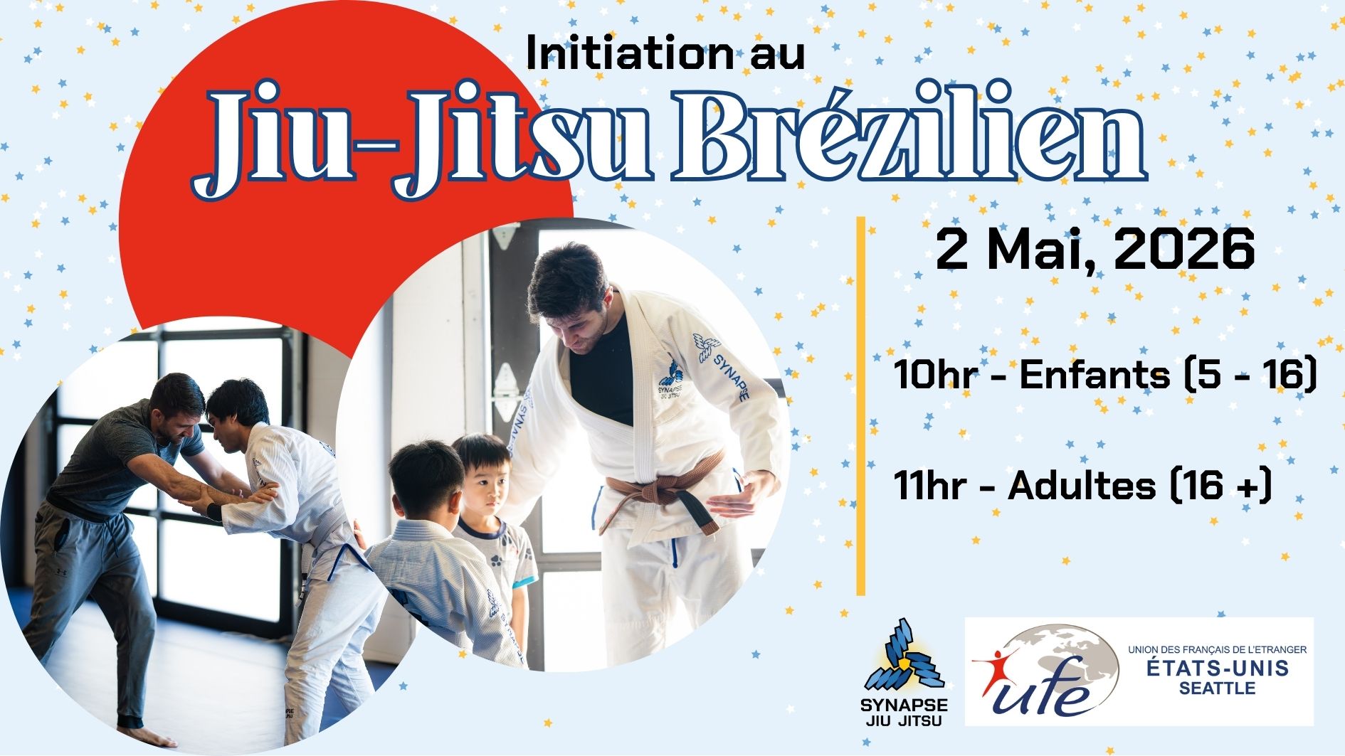 Synapse Jiu Jitsu s’associe avec l’UFE Seattle pour un événement spécial d’initiation au jiu-jitsu brésilien le samedi 2 mai mati dans leur dojo de Bellevue. Une session pour enfants, une pour adultes seront disponibles.